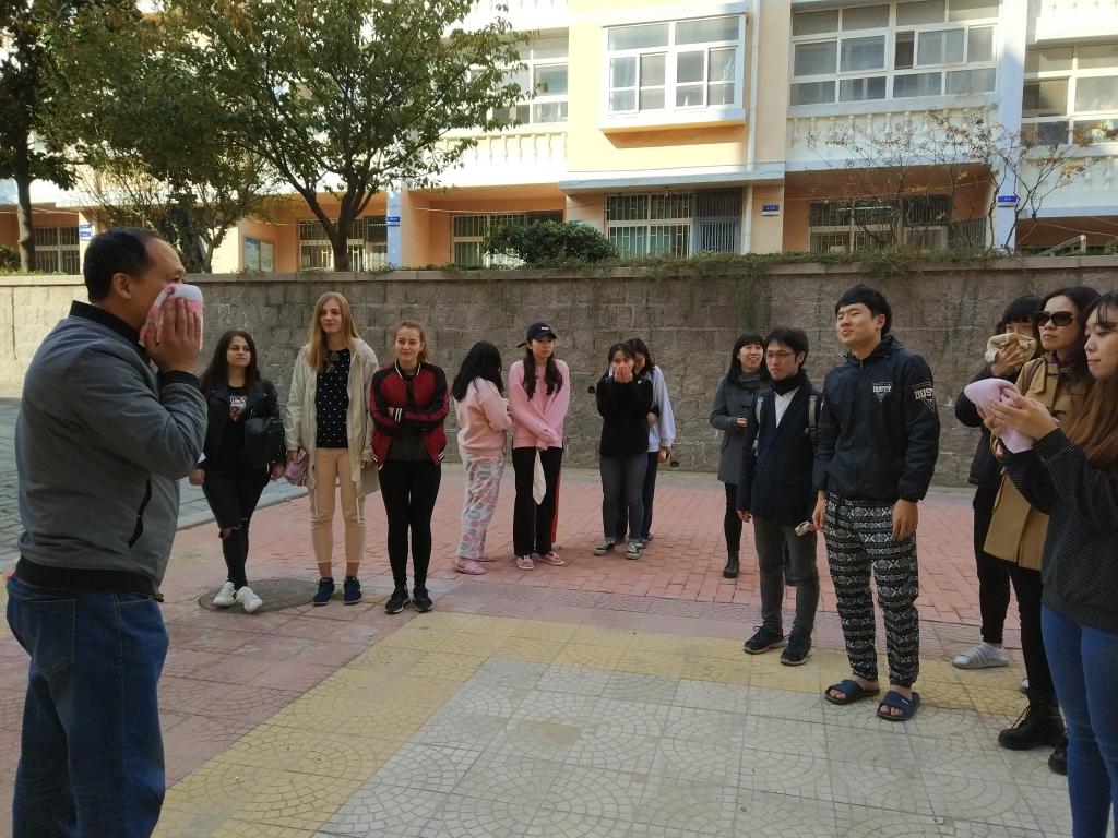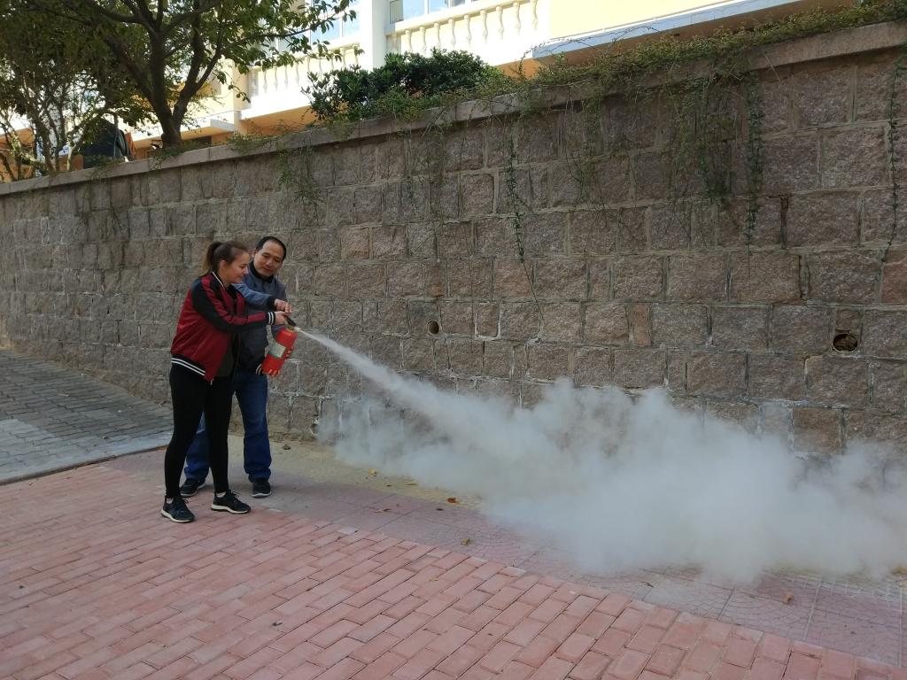 浓烟滚滚的模拟的火灾现场,演练有条不紊地进行着,整个过程前后衔接连贯,成功快速地疏散了留学生,取得了预期效果。随后,赵老师对全体师生进行了灭火器等消防器材的使用方法、注意事项等常见的消防知识的培训。培训中,在老师的指导下,留学生们也拿起灭火器亲自体验灭火的过程。