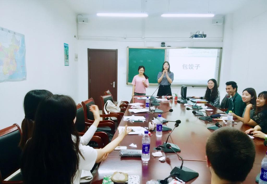 课堂活动以“听中文歌填歌词”活动拉开帷幕,留学生边听音乐边在讲义上填写歌词,并根据歌词内容猜歌名。王老师根据歌词中的语言点给大家做出详细解释,同学们既欣赏了中国歌曲,又练习了汉语听力,学到了中文知识。第二部分为游戏比赛环节,几项比赛均要求参与者具有良好的汉语听说水平,游戏内容与本学期听力课、综合课的教学内容紧密相关,因此要求参与者认真复习一学期所学知识。留学生通过抽签分组,以小组竞赛的方式进行游戏,每名留学生都竭尽所能,表现出色,课堂气氛达到高潮!